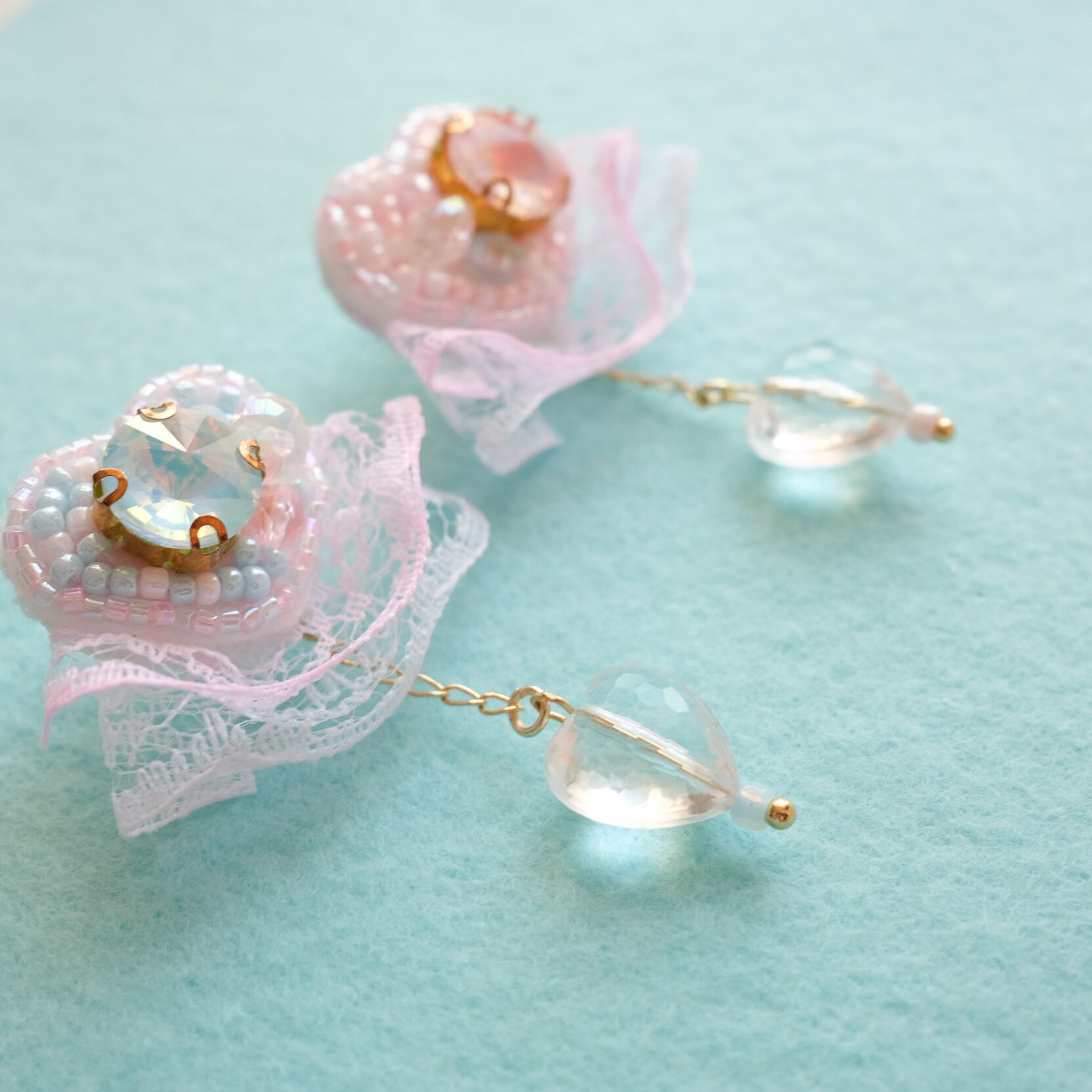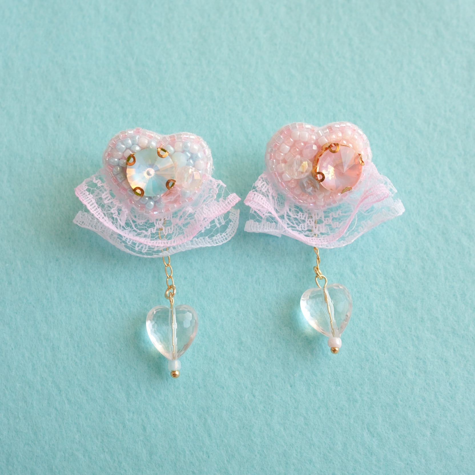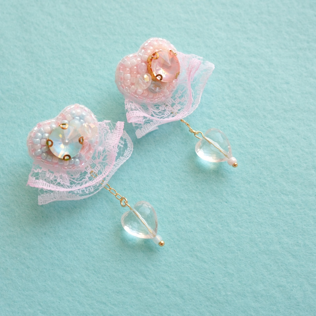 キラキラなハートのビーズと、ピアス本体もハート型にしたラブリーなピアスです♡