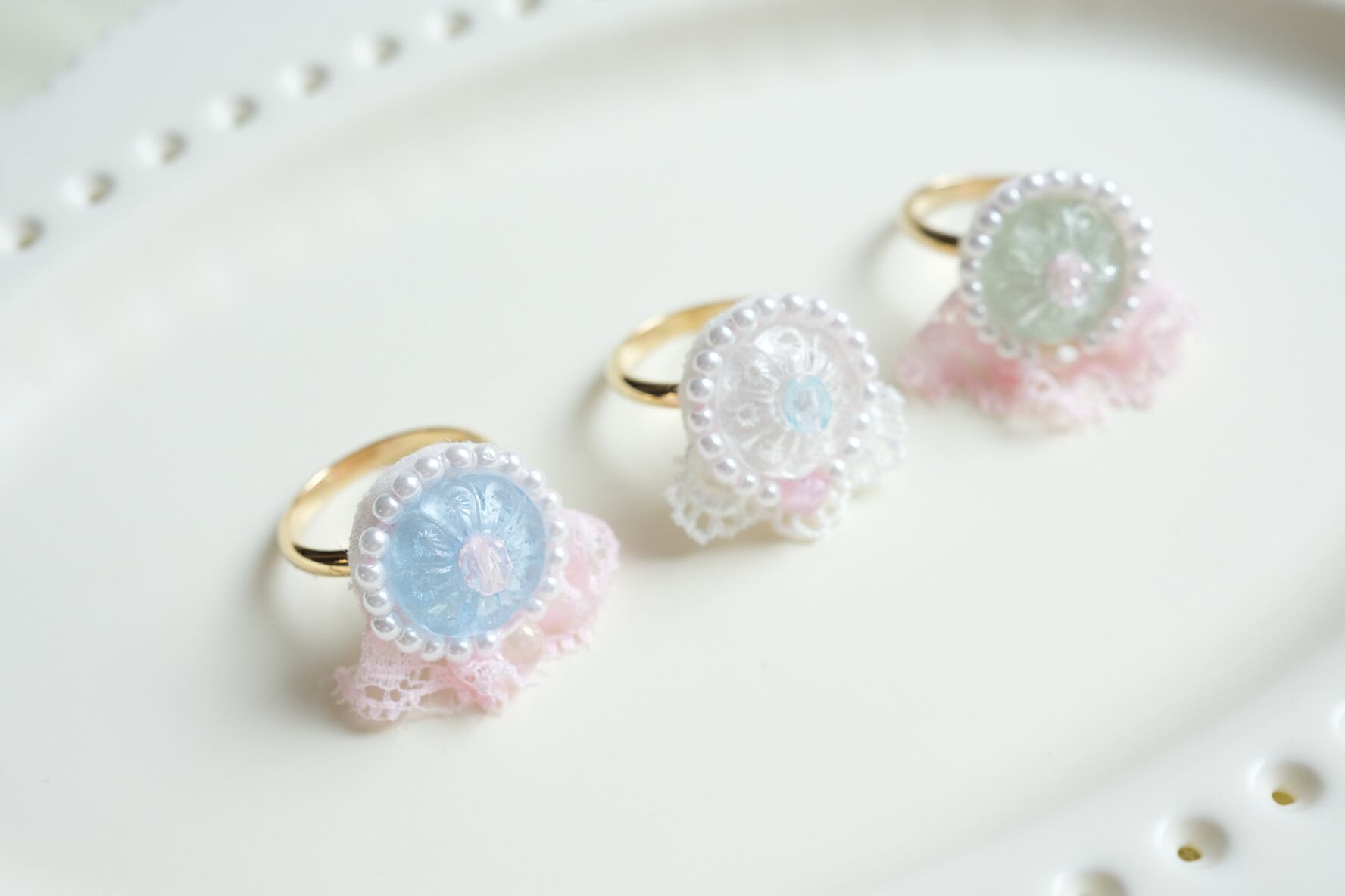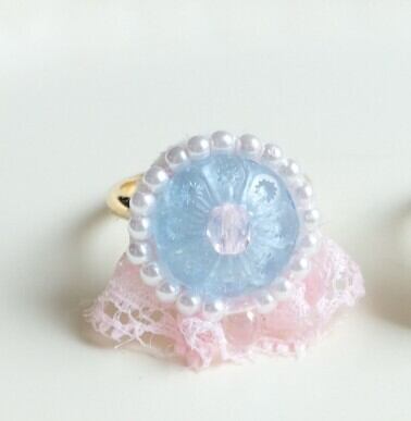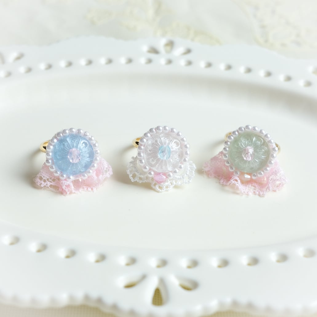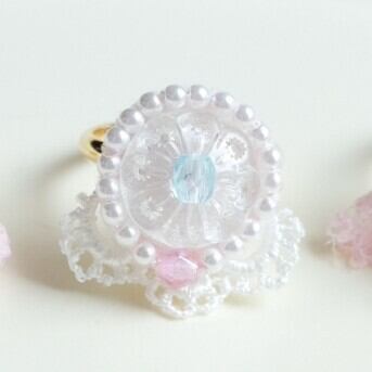 イタリアのヴィンテージボタンを主役に、繊細なレースとビーズで仕立てた特別なリング♡