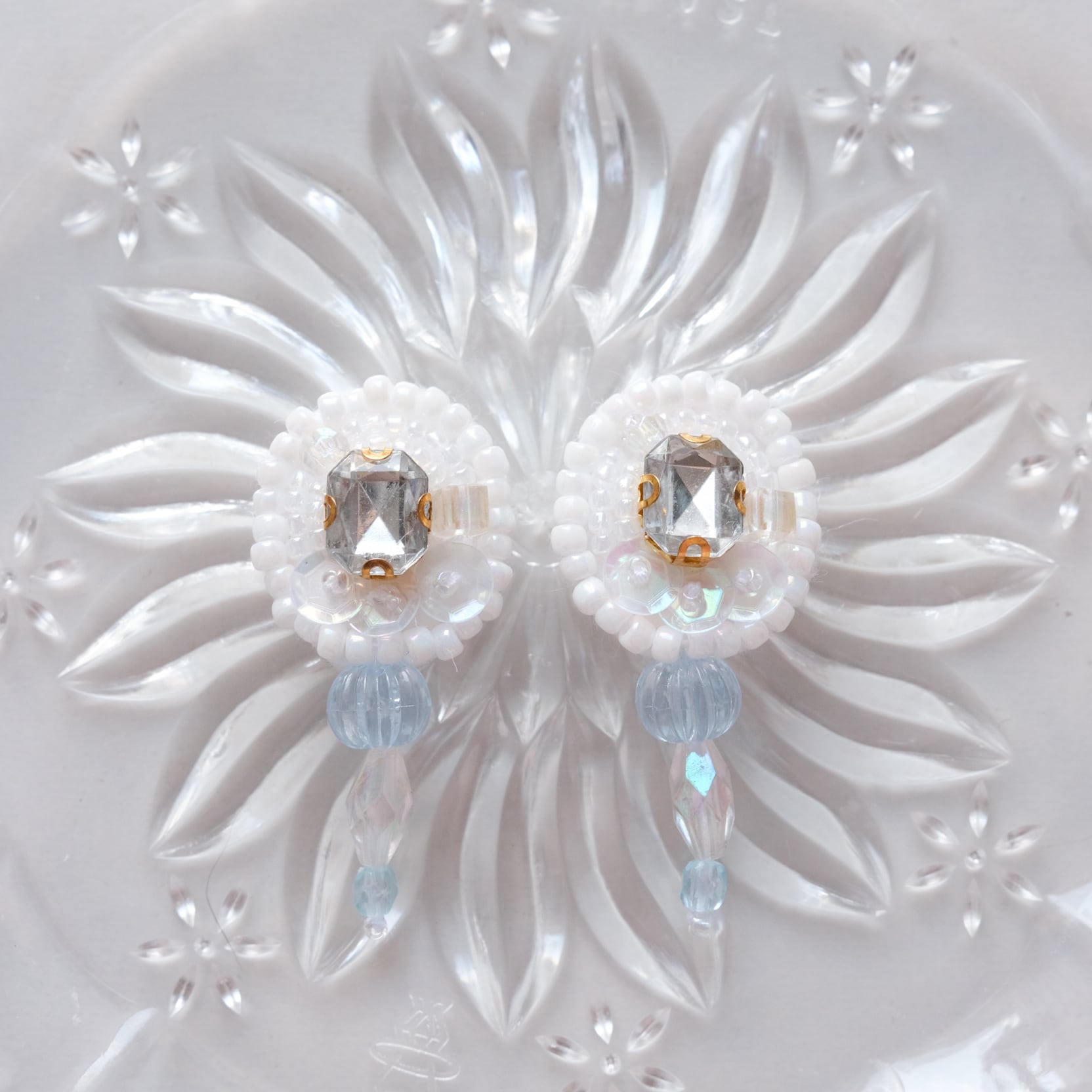 ブルーのビーズと白のビーズでさわやかな雰囲気のイヤリングです❄
