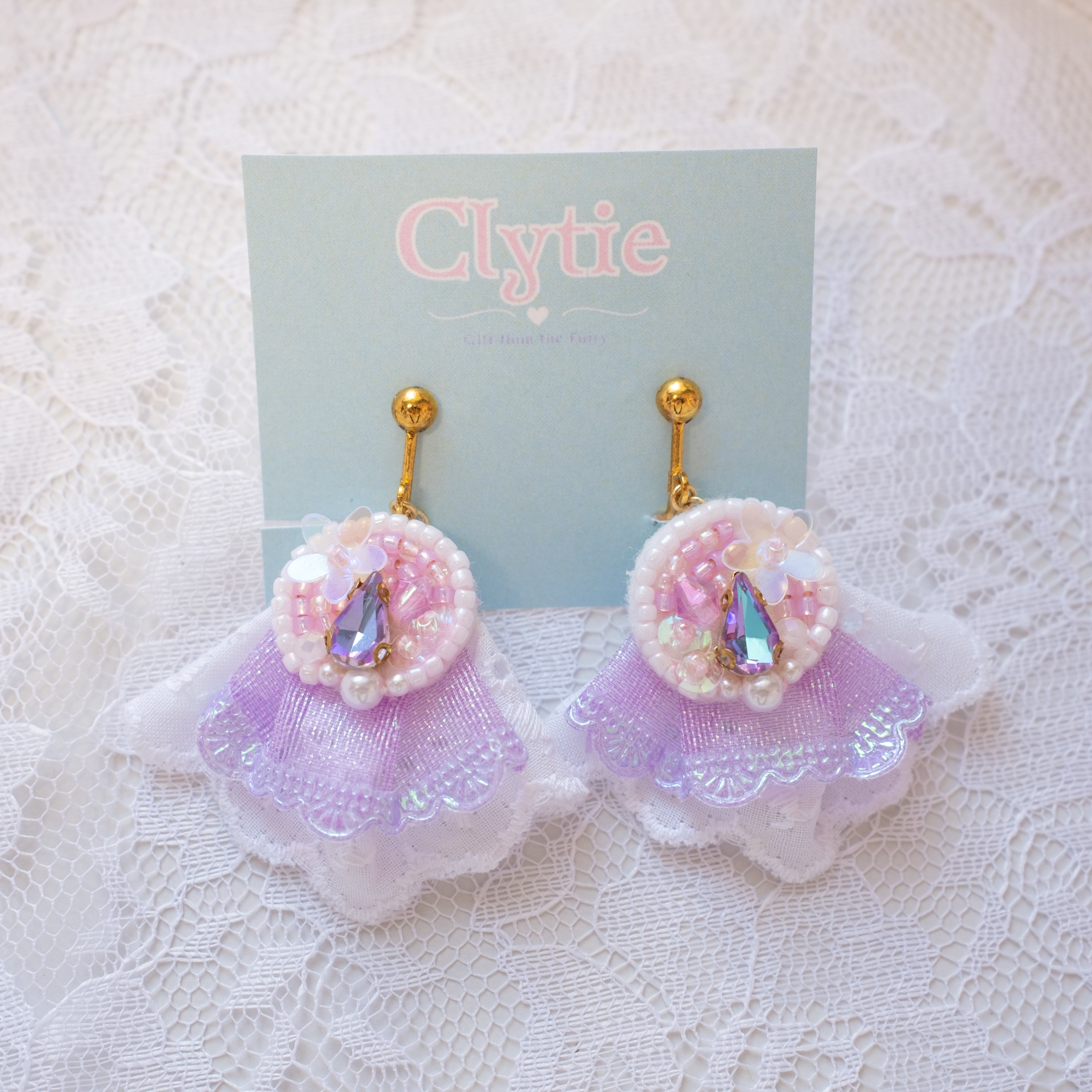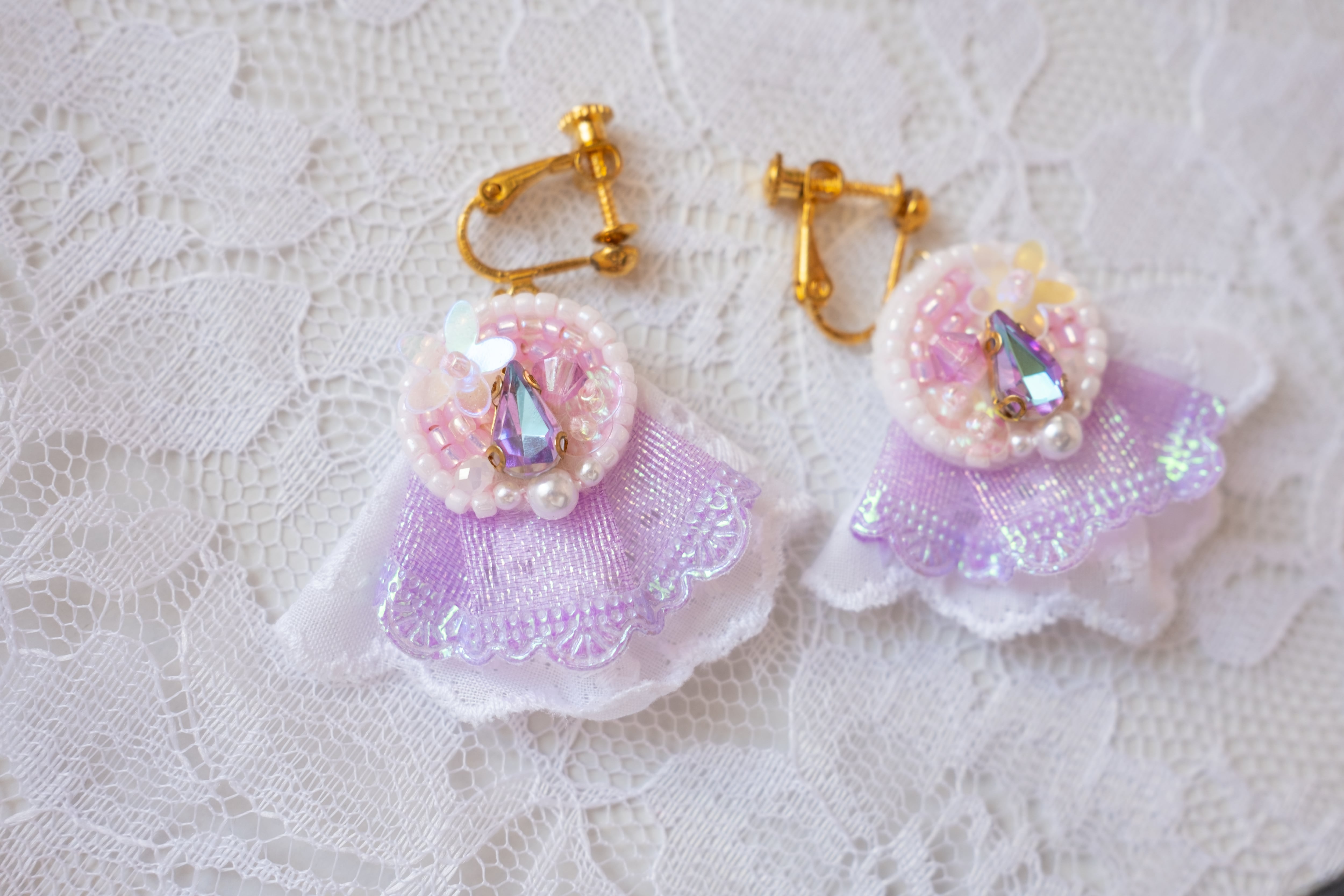 透明感のあるラベンダーカラーのフリルリボンと、オーロラのように輝くビジューが幻想的なイヤリング✩.˚₊